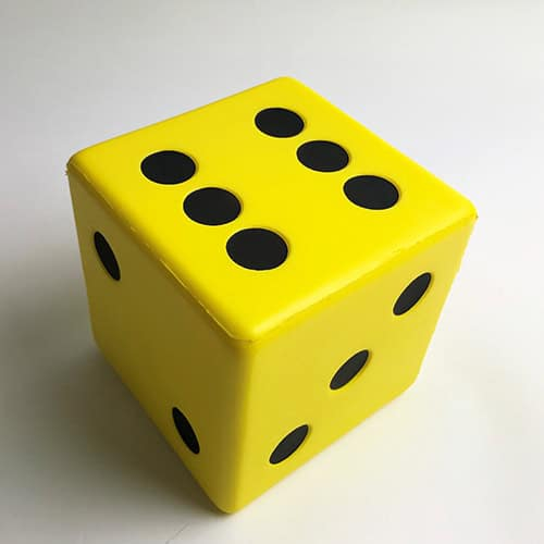 En stor, gul skumterning, med sorte, glatte øjne. Denne skumterning måler 14 centimeter på hvert led, og har en vægt på 235 gram. Den kan bruges af alle! Fra helt små børn som føler og smager, til voksne mennesker som er gået forkert, men ikke kan lade en sådan terning være, fordi den er så indbydende.