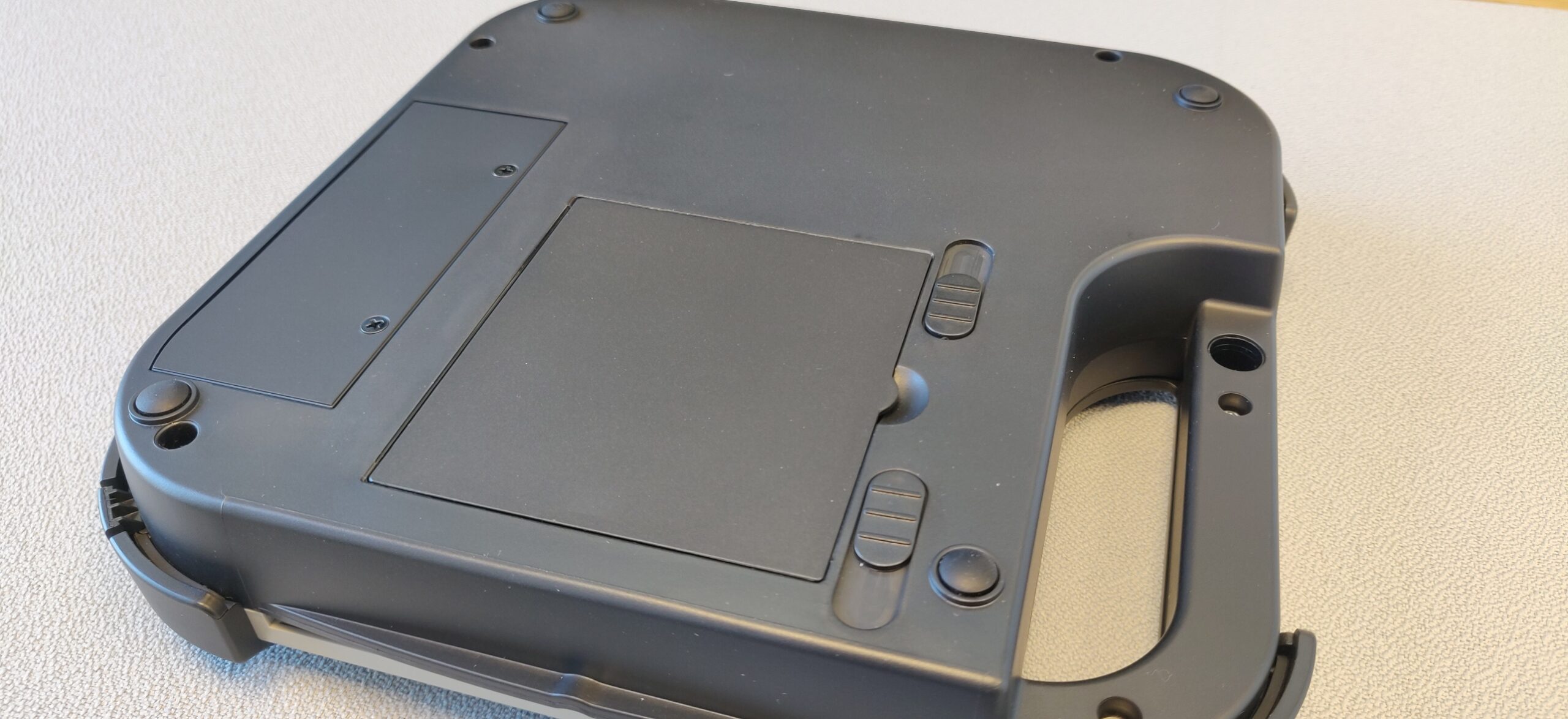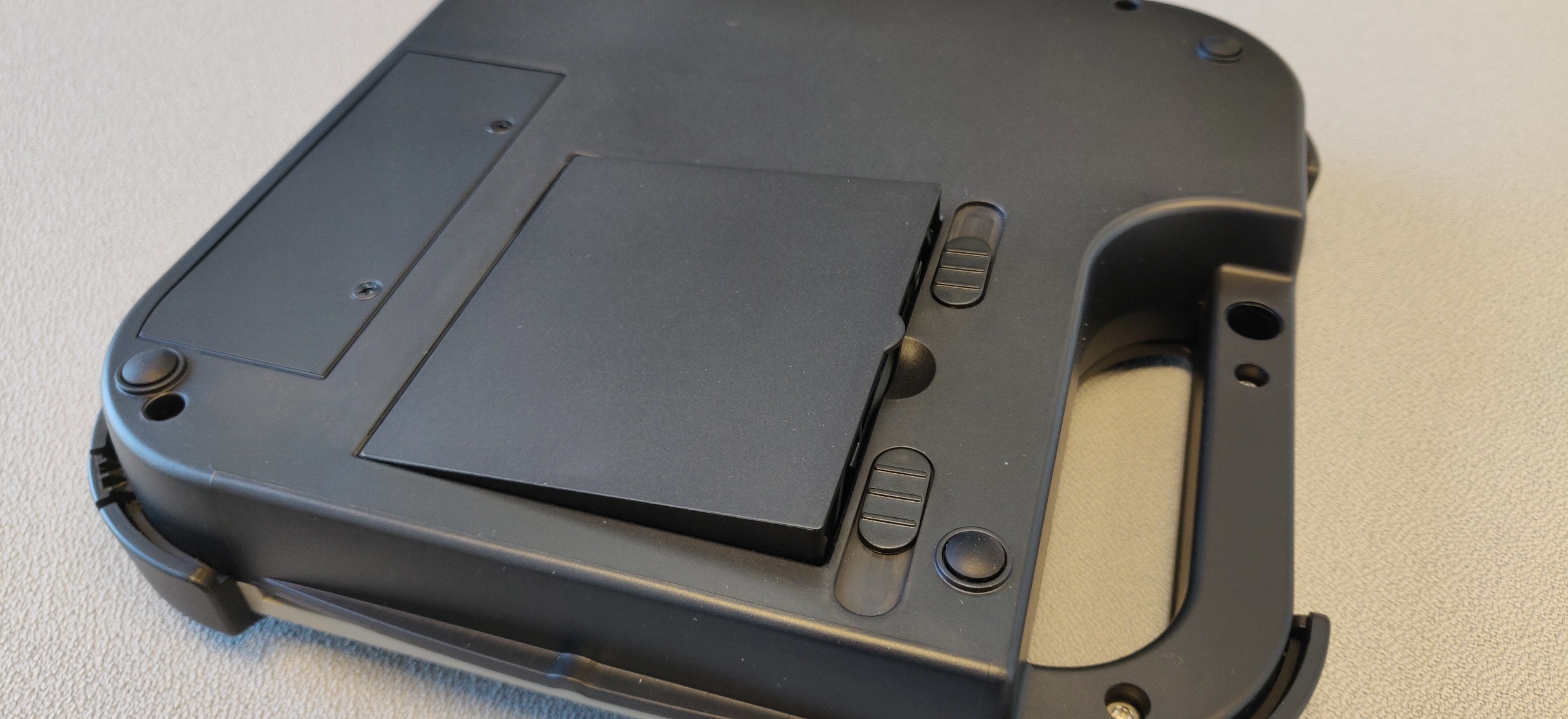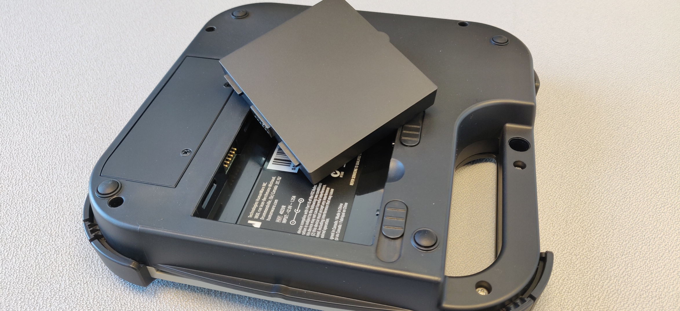Hvis din Victor Reader Stratus enhed ikke længere afspiller uden brug af strømforsyning, eller hvis drifttiden er for kort, kan det tænkes at batteriet har brug for udskiftning. Du kan fjerne det allerede installerede batteri ved at vende din Stratus enhed om, så den er placeret med knapperne nedad. Placer den gerne på et blødt underlag for at passe på den. Bunden vender nu opad. Ud fra håndtaget på enheden finder du to skydeknapper. Disse to skubbes væk fra hinanden, hvorved batteriet springer fri. Sørg for ikke at holde på selve batteriet samtidigt, da det vil gøre opgaven svær. Vær opmærksom på hvordan batteriet er orienteret når du fjerner det, da det nye batteri skal installeres på samme måde. Det nye batteri skal først orienteres så det møder messingkontakterne i venstre side af batteriområdet, og skubbes ned på plads. De to skydeknapper vil springe på plads.